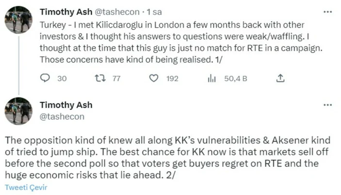 Yazar Timothy Ash, Kılıçdaroğlu'na 2. tur öncesi borsada spekülasyonlarla ekonomiyi hedef alması önerisinde bulundu.