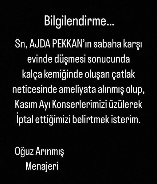 "Sn. Ajda Pekkan'ın sabaha karşı evinde düşmesi sonucunda kalça kemiğinde oluşan çatlak neticesinde ameliyata alınmış olup, kasım ayı konserlerimizi üzülerek iptal ettiğimizi belirtmek isterim. Oğuz Arınmış Menajeri."