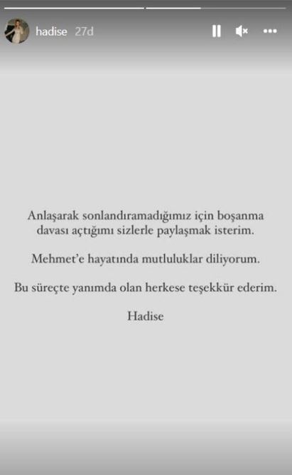 Tüm bu haberlerden sonra Hadise sosyal medyadan boşanacağını duyurdu. Yazdığı notta "Anlaşarak sonlandıramadığımız için" ifadesini kullanması dikkat çekti.